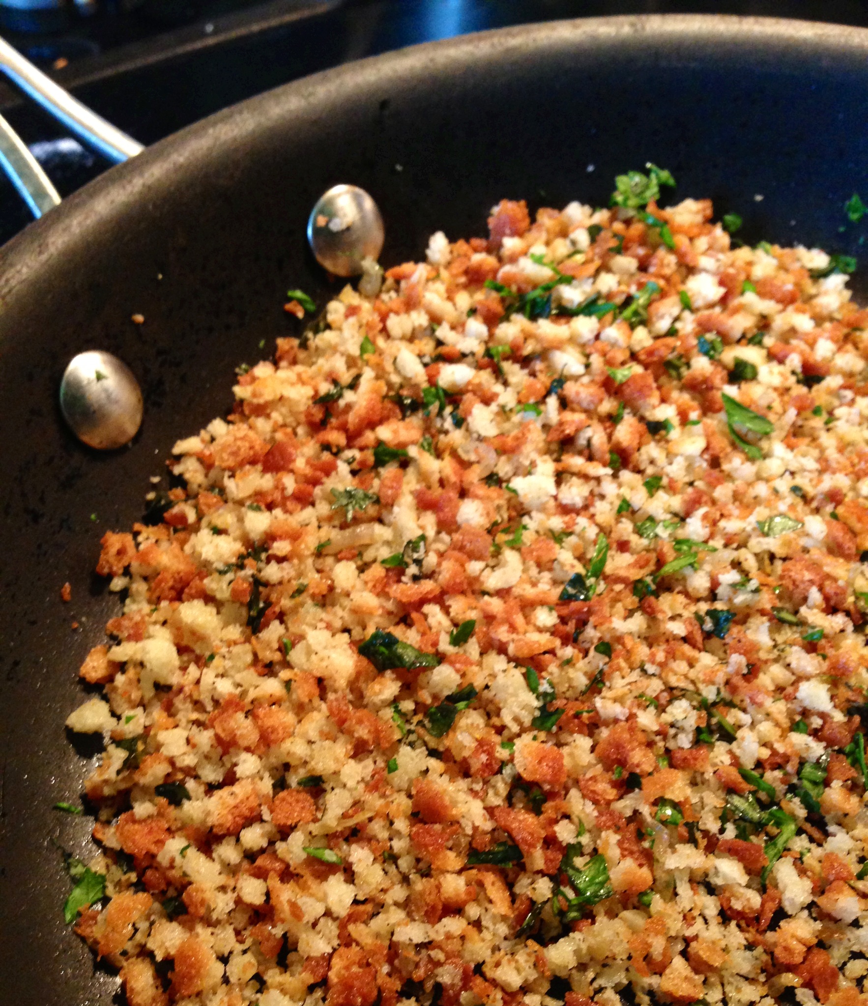Heat a few tablespoons of olive oil in a pan and saute shallots until they become translucent. Add garlic to pan, followed by breadcrumbs. Toss until breadcrumbs appear evenly coated in olive oil. If they appear too dry, drizzle a little extra. Stir over medium heat for 6-7 minutes so they brown slowly and become crispy. Remove from heat and stir in chopped herbs. Sprinkle a little salt and pepper to taste. Set aside to cool.