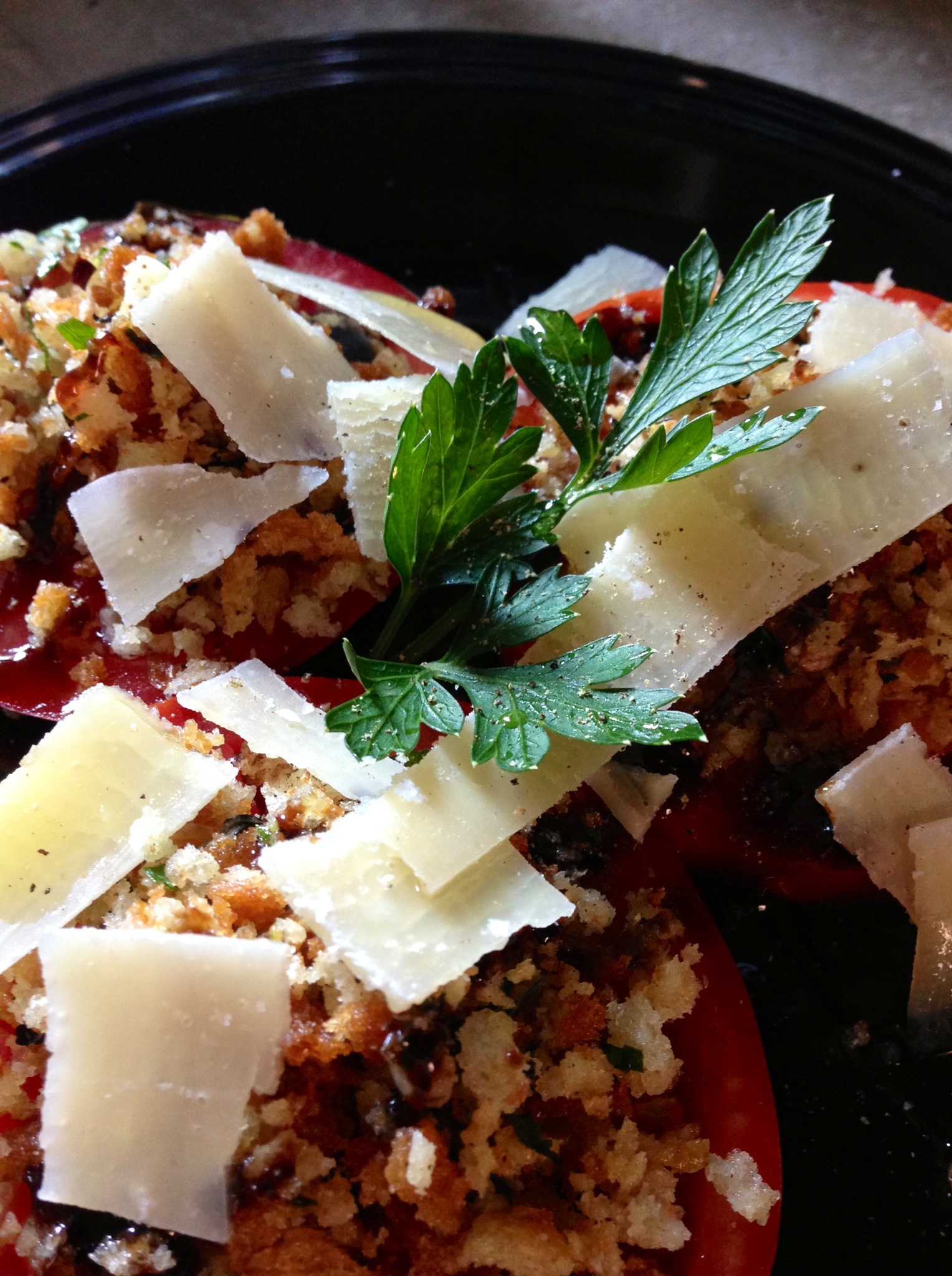 Slice tomatoes and arrange on plate. Sprinkle liberally with breadcrumb mixture. Top with a couple shavings of freshly shaved Parmigiano-Reggiano cheese, drizzle with balsamic glaze and finish with a couple turns of freshly cracked black pepper. Enjoy!