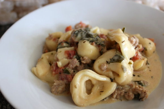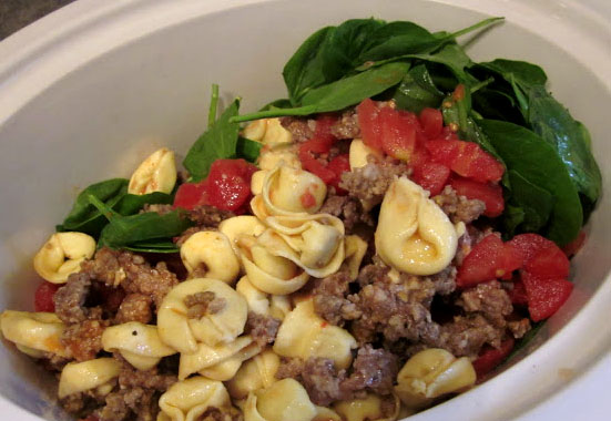 spinach_tortellini_crockpotRECIPE: Creamy Cheese Tortellini with Spinach, Tomatoes, Sausage & Pesto