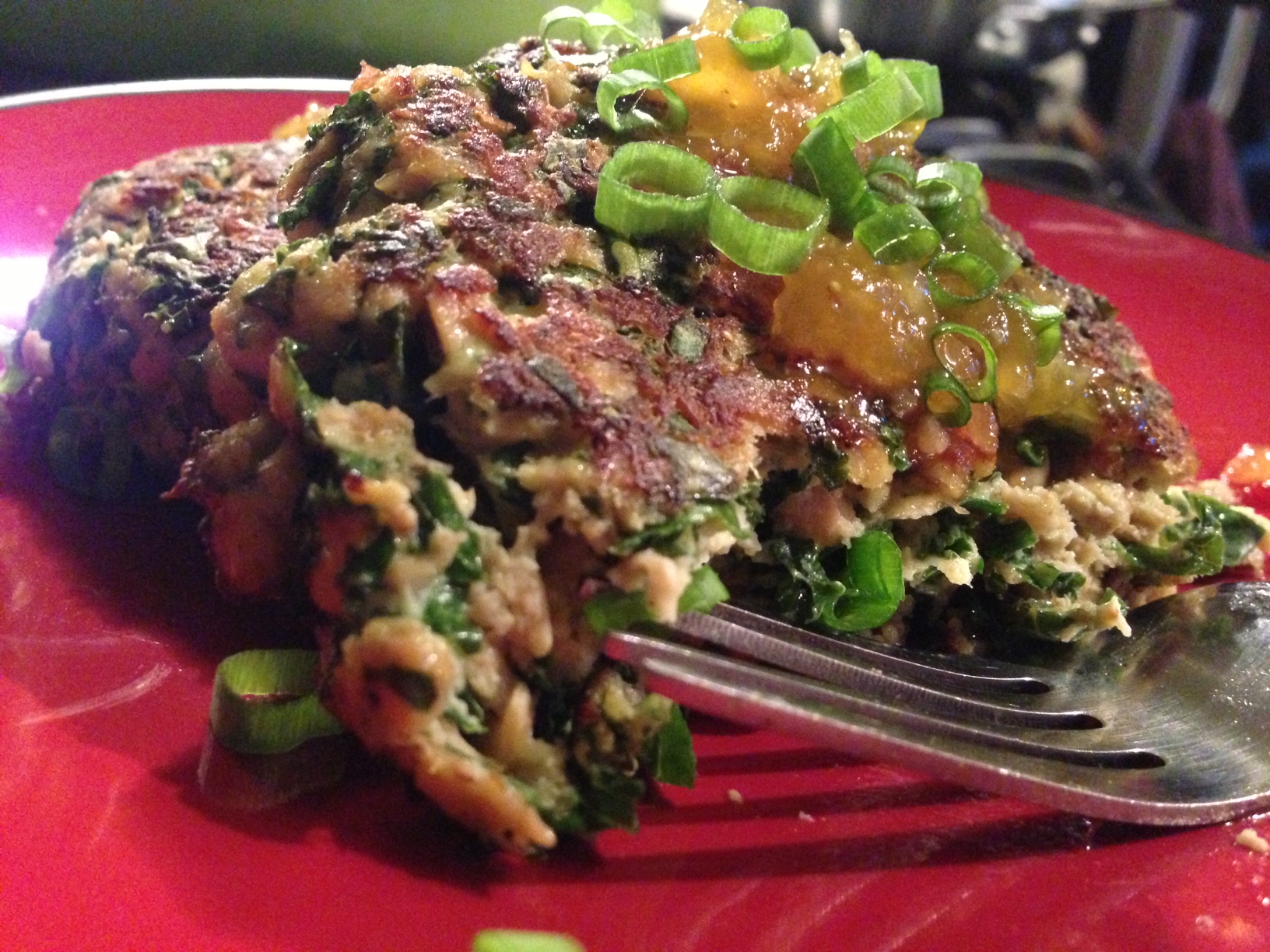 Sometimes dinner comes from the pantry because I can’t spend every day shopping or waiting for something to defrost. This recipe happened one day when the fridge was pretty bare. With the exception of the kale, everything else tends to be a staple for most. The jam is something my mom recently made for shrimp, so I thought it would be tasty on the salmon cakes, and it was. Serve the whole shebang on top of a large arugula salad with a lemon vinaigrette. This recipe makes 2 large or 3 average sized cakes.