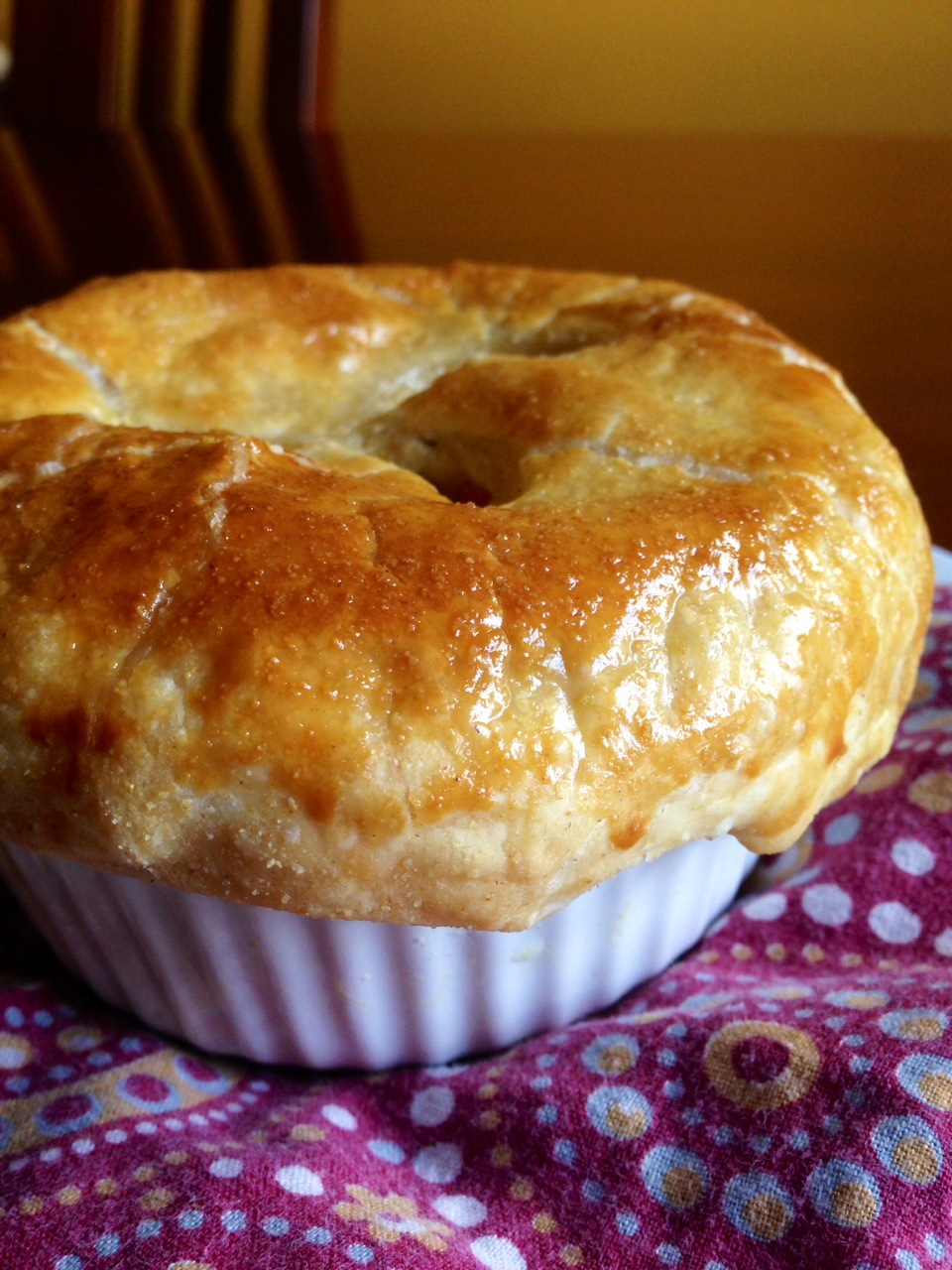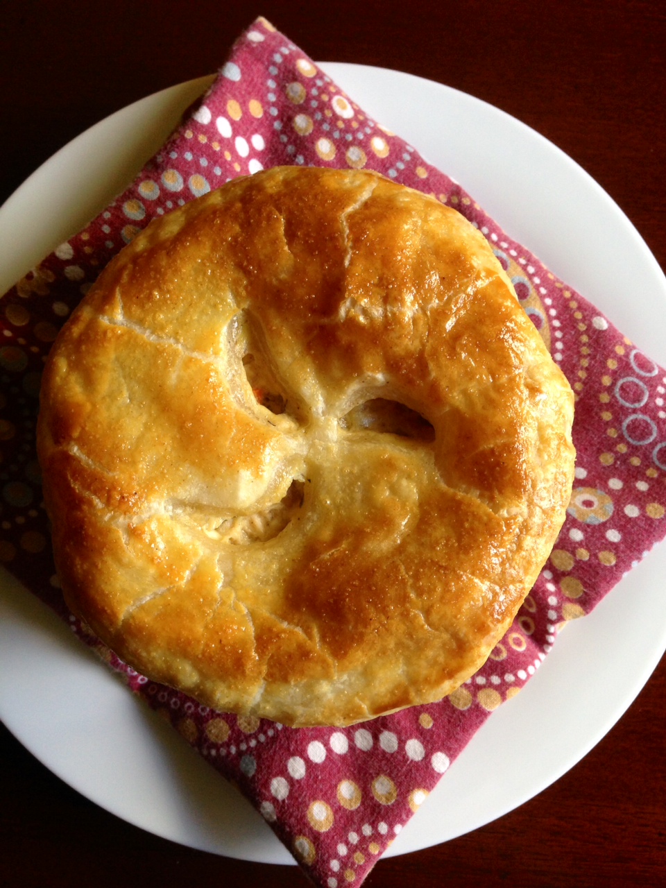 puffpastry_potpieDivide mixture among 4 large or 6 smaller oven-safe bowls, mugs or ramekins (something that is deeper, rather than a long cassarole-shaped dish that would require more pastry to cover). Whatever dish you use, flip it upside down on the pastry and cut out a shape slightly larger than your dish. Cover the filled dishes with the slightly oversized pastry and push it against the edges. Brush the pastry with the egg wash and using a knife, cut a couple of slits in the top to let the steam escape. Bake the pot pies in a 425 degree oven for 30 minutes or until the pastry puffs up and turns a nice golden brown.