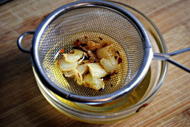 DIRECTIONS: Pour 1/4 cup olive oil into a small saucepan. Add 2 cloves of smashed garlic and 1/2 tsp red chile flakes. Slowly heat oil until garlic starts to brown. Remove from heat and strain to remove the chiles and garlic (you’ll have more than the recipe requires – store it in the fridge).