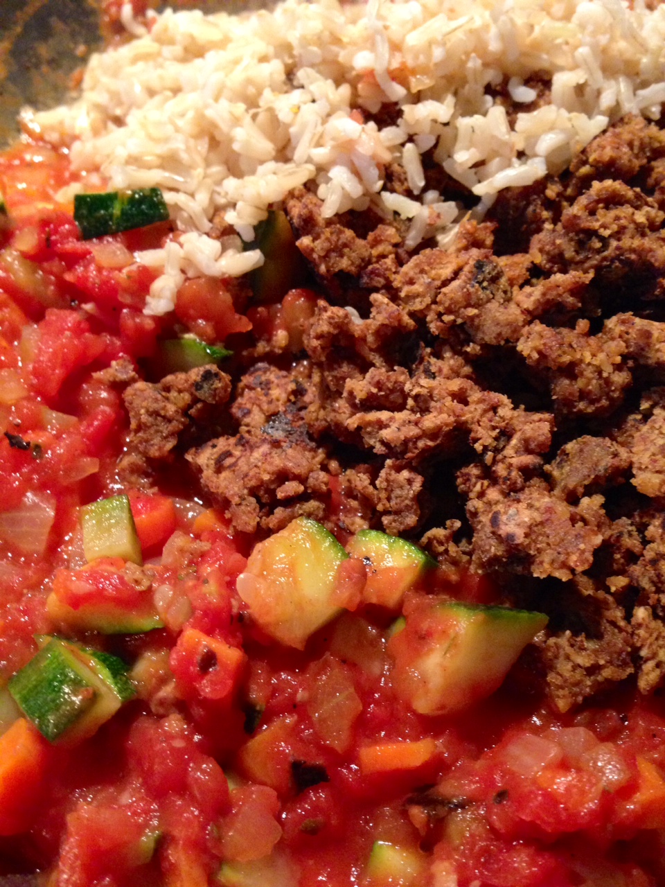 Heat a couple tablespoons of olive oil in a large saute pan over medium-high heat and brown neat like you would ground beef. Set aside. Add a little more olive oil and add the onion, zucchini, carrots, dried oregano, salt and pepper to the pan. Saute just until veggies start to brown (approx 5 minutes); pour in tomatoes; let simmer for 5 minutes; adjust salt and pepper to taste. Reserve 2 cups of sauce for topping.