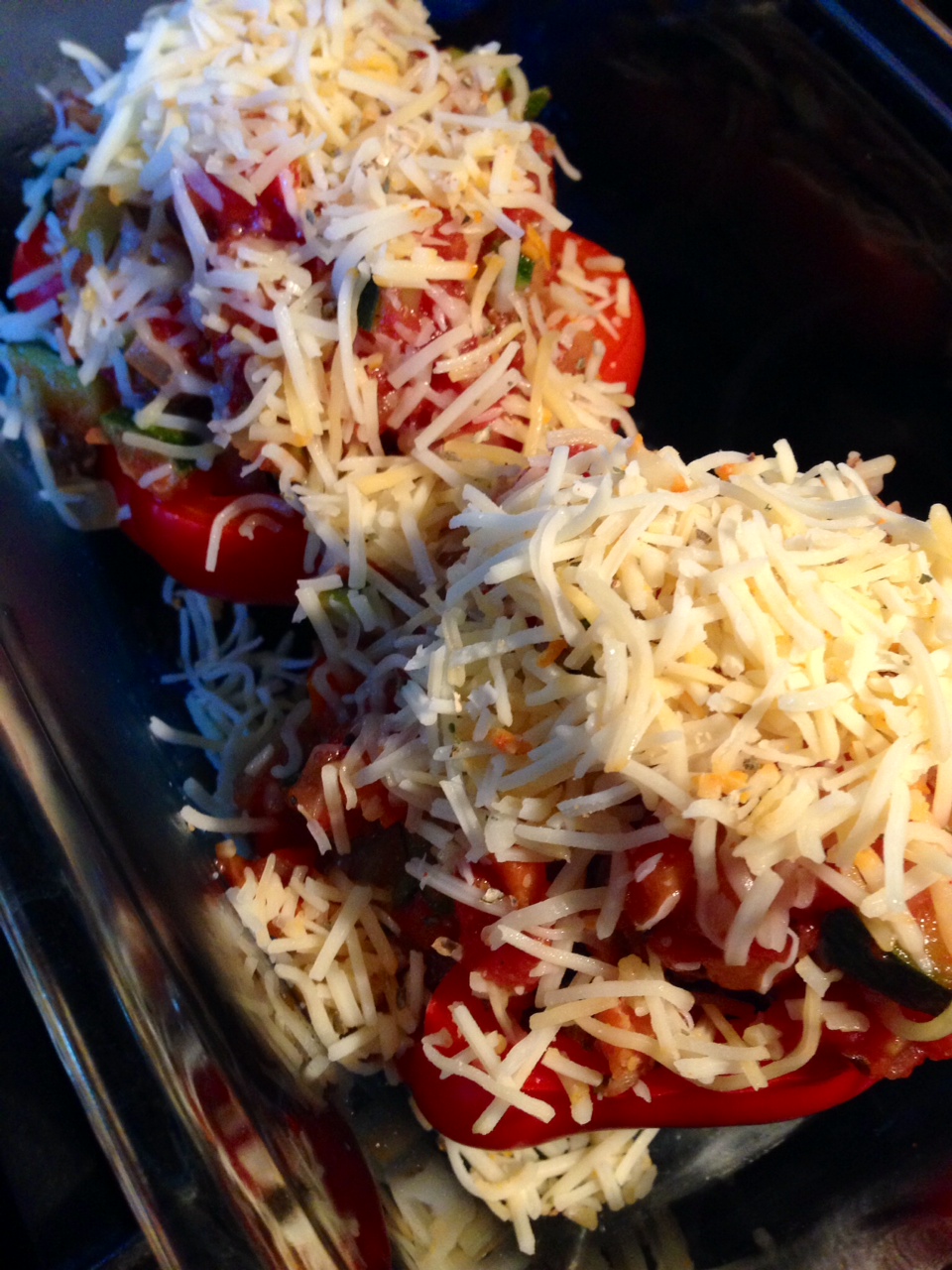 peppersuncookedAdd neat and brown rice to the mixture and combine. Spoon mixture evenly among pepper halves. Top with reserved tomato mixture and cheese; bake covered with foil for 45 minutes. Remove foil for the last ten minutes to get a little color on the cheese. Garnish with fresh scallions. Enjoy!