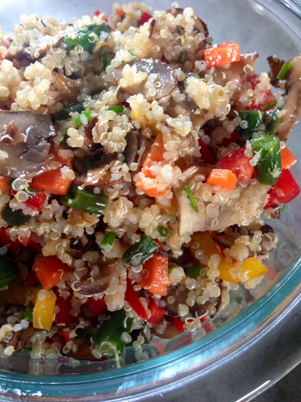 NOTE: This can be made into a vegetarian meal by substituting diced, baked tofu instead of the shrimp. ANOTHER NOTE: I recommend cooking the quinoa in stock instead of water to give it more flavor.