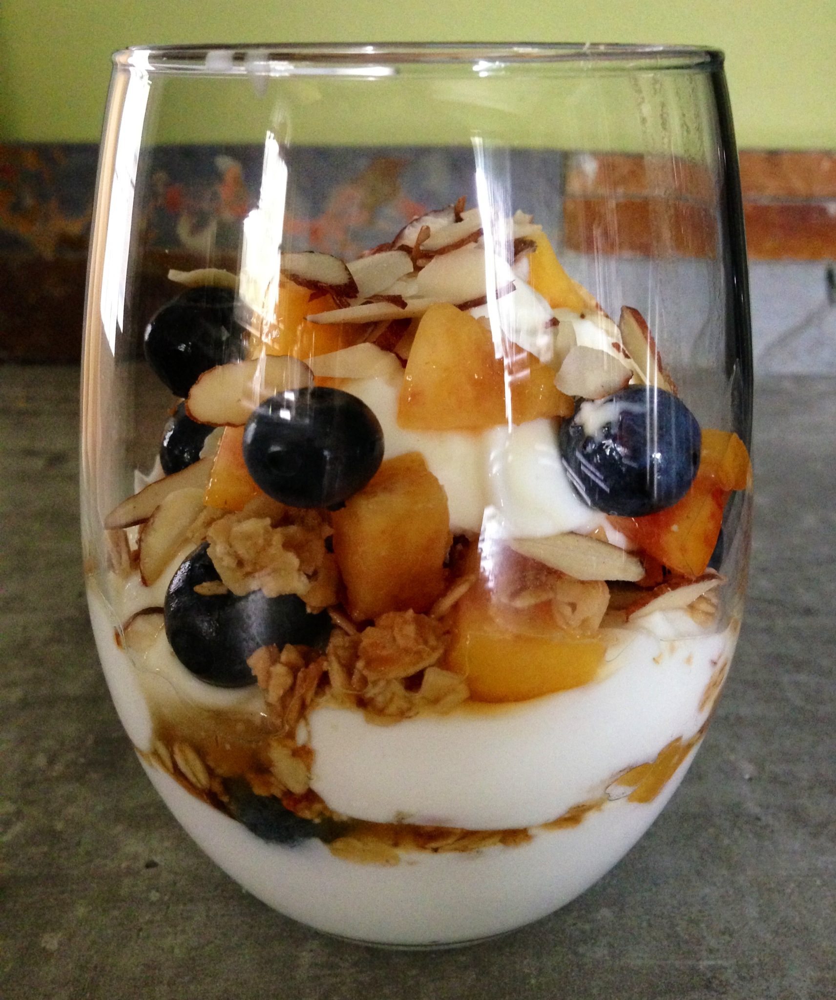 Layer half of the yogurt, a drizzle of maple syrup, half the fruit, a liberal sprinkle of granola and almonds. Repeat. Or you can throw it all in a bowl together if you’re eating it at your desk, which is how mine is most often consumed. Today, I had an extremely ripe peach and some local blueberries, so it was extra delicious. Enjoy!