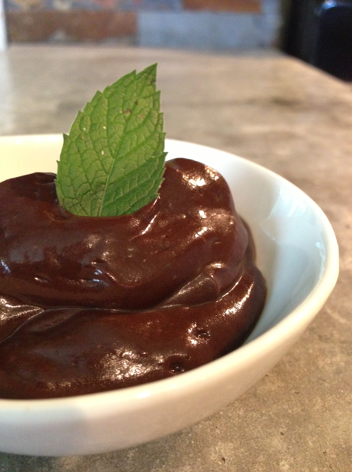 In a separate bowl, add the coconut milk and 1 tsp vanilla. Beat with a mixer until smooth. Combine (by hand – not with your hands – using a spoon) the chocolate mixture with the coconut milk to lighten up the texture. Refrigerate for at least an hour. Serve in small bowls and garnish with a mint leaf, if you have it.